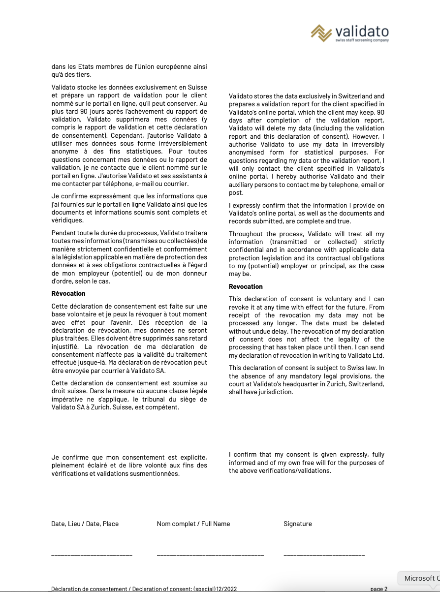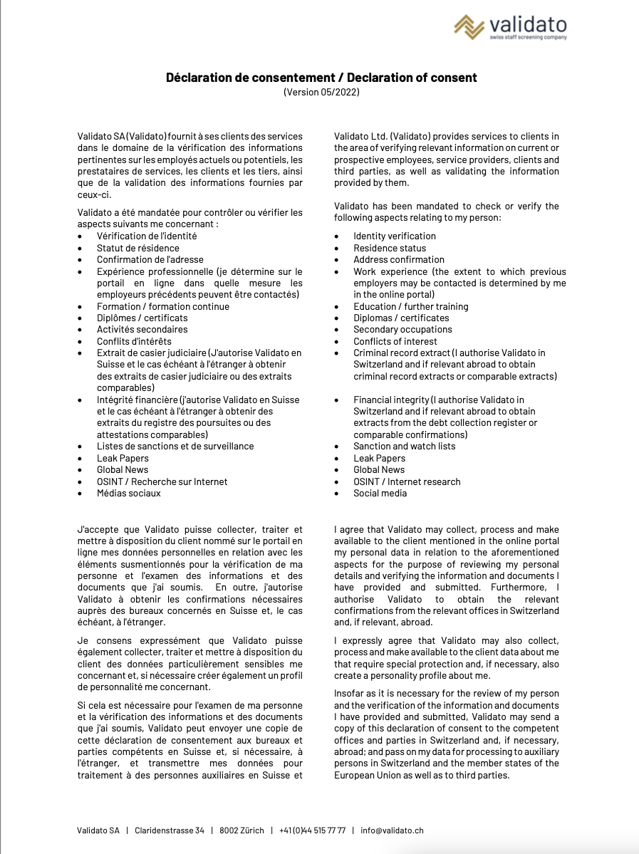In the documents we search first for filled Validato Declaration of Consent form. Example below BUT there are more types of Declaration forms from Validato, all designed in same style only text is different, following one is only informative: